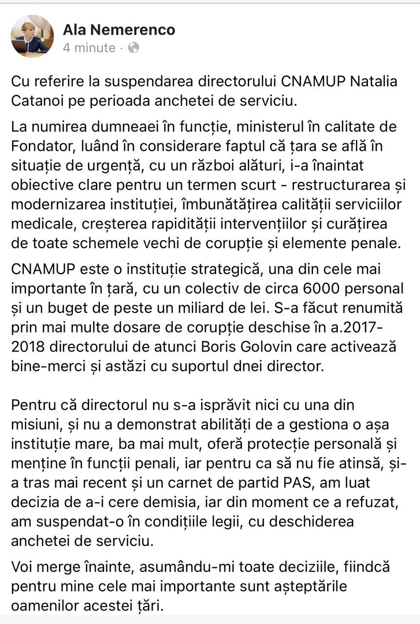 ”Pentru că directorul nu s-a isprăvit nici cu una din misiuni, și nu a demonstrat abilități de a gestiona o așa instituție mare, ba mai mult, oferă protecție personală și menține în funcții penali, iar pentru ca să nu fie atinsă, și-a tras mai recent și un carnet de partid PAS, am luat decizia de a-i cere demisia, iar din moment ce a refuzat, am suspendat-o în condițiile legii, cu deschiderea anchetei de serviciu.”, a scris Nemerenco.