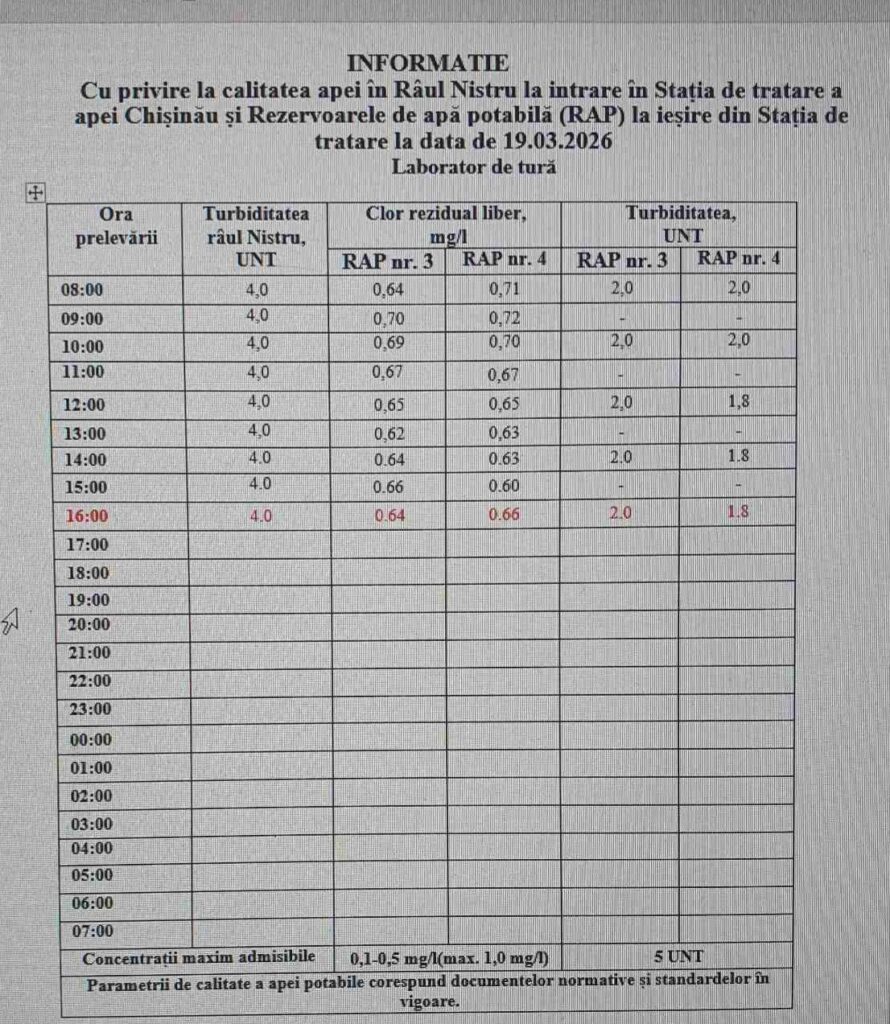 Potrivit datelor prezentate, analizele efectuate în ultimele 24 de ore confirmă că apa se încadrează în parametrii de siguranță, cele mai recente rezultate fiind înregistrate la ora 16:00.