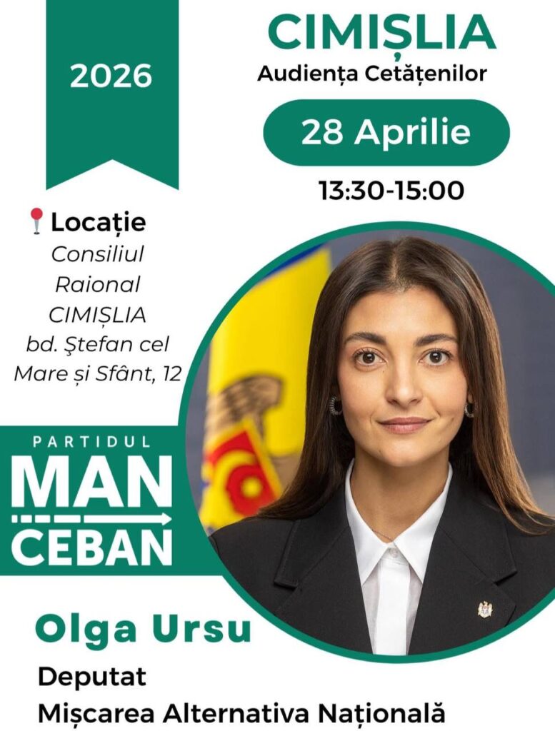 Partidul Mișcarea Alternativa Națională (MAN) anunță continuarea audiențelor în teritoriu organizate de deputatele formațiunii Angela Cutasevici și Olga Ursu, în cadrul cărora acestea vor discuta direct cu cetățenii despre problemele comunităților locale.