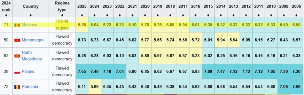 Potrivit deputatului, această evaluare arată că în Republica Moldova democrația se deteriorează, slăbesc instituțiile, scade nivelul concurenței politice, iar încrederea în sistem este în scădere. Gaik Vartanean a subliniat că, în timp ce alte state au reușit să-și îmbunătățească pozițiile în clasament, Moldova a coborât.