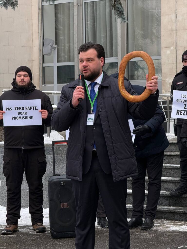 În semn simbolic, participanții au oferit Guvernului un covrig, pentru a ilustra că promisiunile de bunăstare pentru cetățeni nu s-au concretizat.