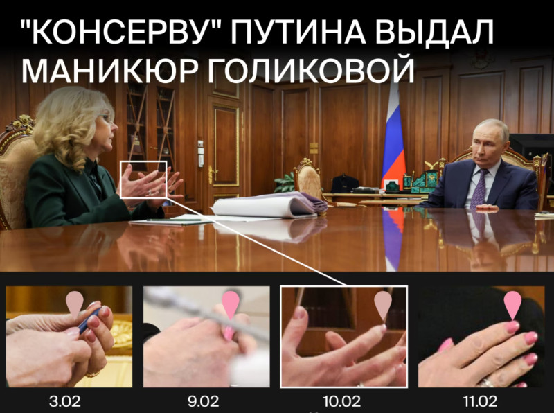 Pe 10 februarie, Kremlinul a dat publicității informații despre întâlnirea dintre Putin și Golikova. La această întâlnire, Golikova avea manichiura de culoare roz prăfuit. Cu toate că, exact cu o zi înainte de publicarea informațiilor despre întâlnire la Kremlin și a doua zi după aceasta, la evenimentele publice, unghiile Golikovei erau vopsite într-o nuanță mai strălucitoare de roz „Barbie”. În același timp, Golikova a purtat aceeași nuanță de roz prăfuit ca la întâlnirea cu Putin la începutul lunii februarie 2026 – atunci se presupune că a fost înregistrată această „conservă”.