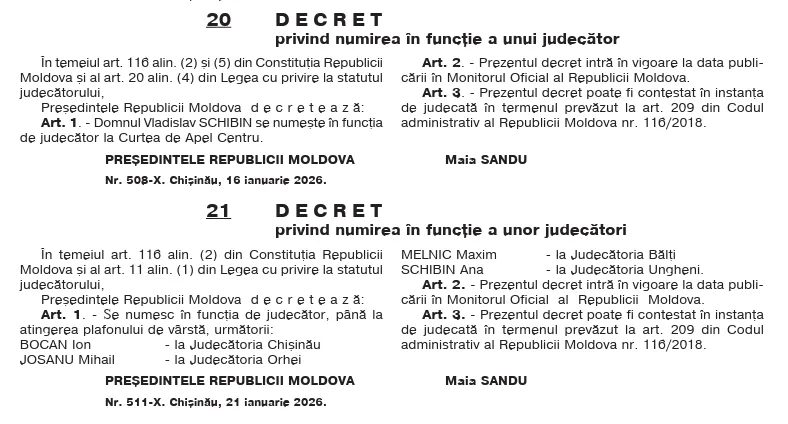 Potrivit documentului, Vladislav Schibin a fost numit în funcția de judecător la Curtea de Apel Centru. De asemenea, Ion Bocan a fost numit în funcția de magistrat la Judecătoria Chișinău, Mihail Josanu – la Judecătoria Orhei, Maxim Melnic – la Judecătoria Bălți și Ana Schibin – la Judecătoria Ungheni, transmite politics.md cu referire la moldpres.md.