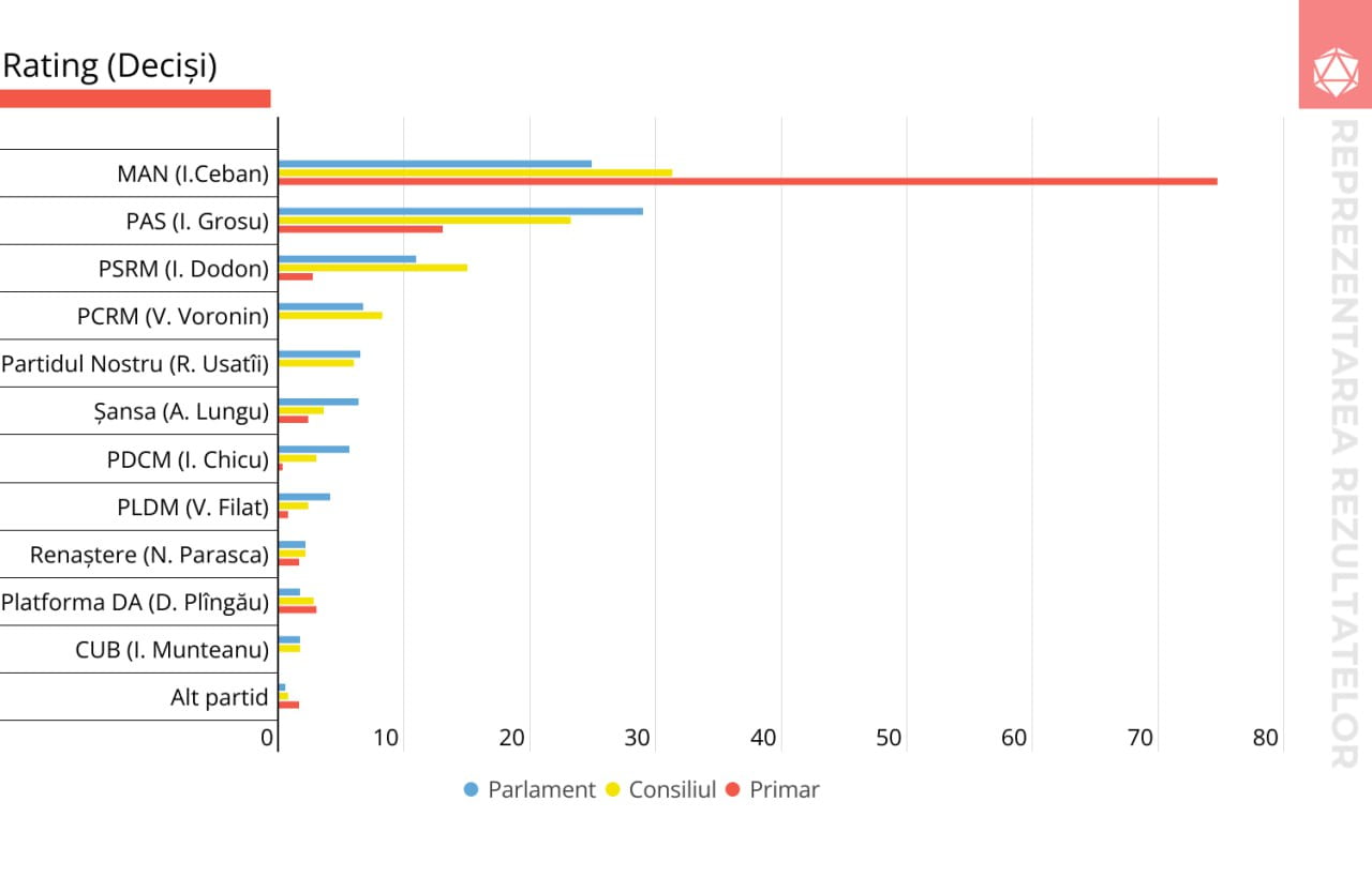 Rezultatele unui sondaj recent arată că primarul actual al Chișinăului, Ion Ceban, se bucură de o poziție puternică în preferințele cetățenilor, cu recunoaștere și evaluări pozitive din partea majorității respondenților. Cu toate acestea, principalul său oponent, Carp, se confruntă cu un potențial de creștere limitat în sondaje, cu riscul de a nu accede nici măcar în al doilea tur al alegerilor.