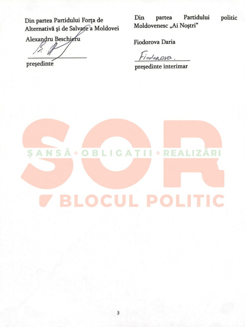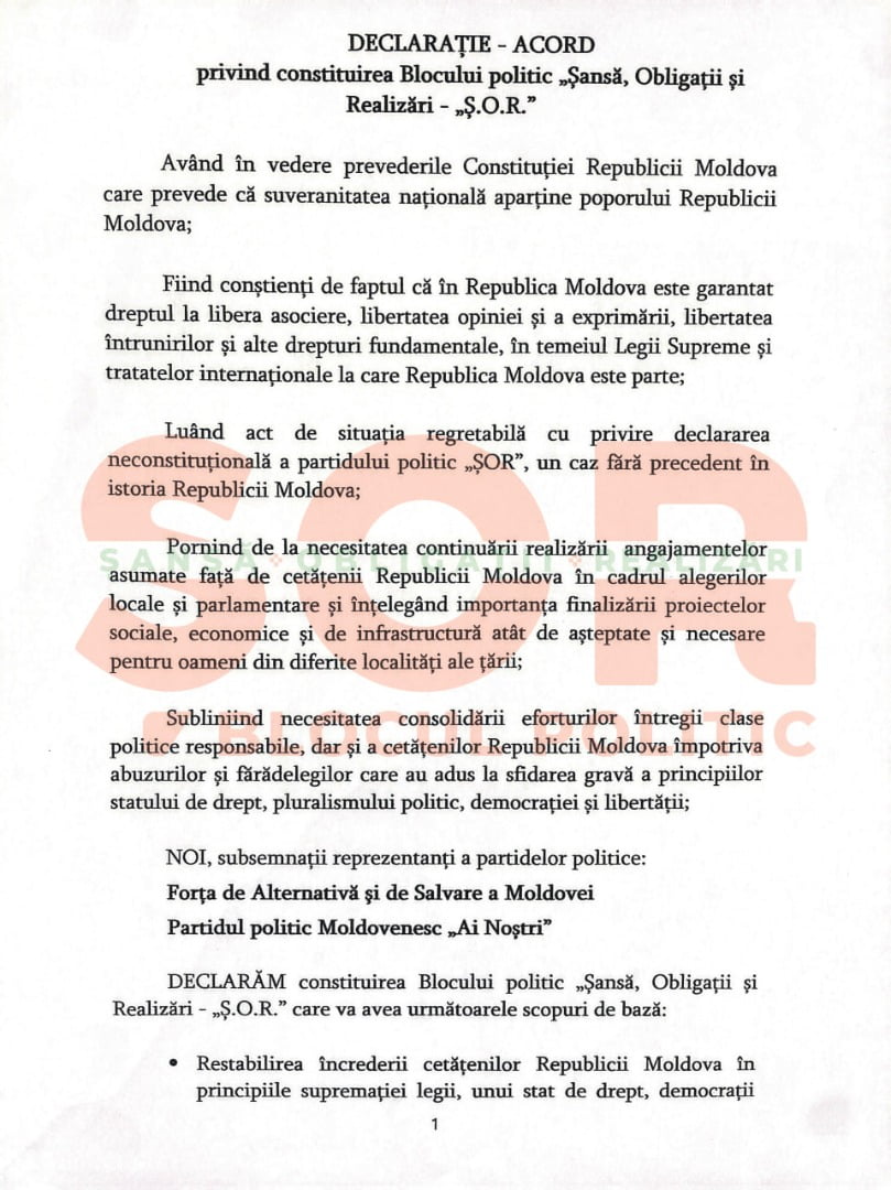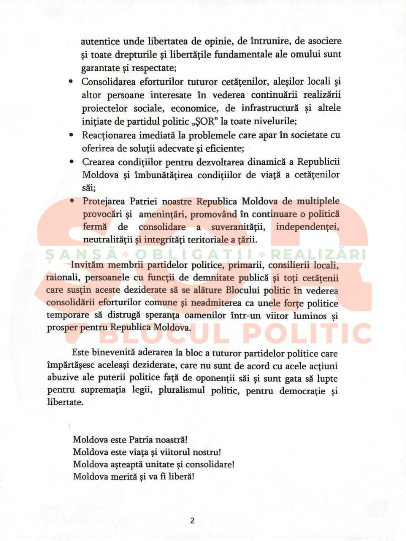 „Toate celelalte forțe politice, primari, consilieri locali, raionali, persoane cu funcții de demnitate publică și toți cetățenii care nu sunt de acord cu acțiunile abuzive ale guvernării și sunt gata să lupte pentru supremația legii, pluralismul politic, democrație, libertate, viitor luminos și prosper pentru Republica Moldova, sunt invitați să se alăture cât mai curând la Blocul „Ș.O.R.” Moldova este Patria noastră! Moldova este viața și viitorul nostru! Moldova așteaptă unitate și consolidare! Moldova merită și va fi liberă!”, se arată în declarația-acord semnată de reprezentanții Blocului politic „Ș.O.R”.