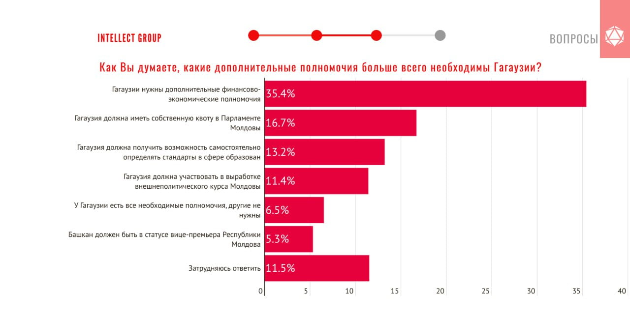 Potrivit locuitorilor din autonomia găgăuză, regiunea are nevoie de puteri financiare și economice suplimentare, de o cotă proprie în Parlamentul Republicii Moldova și de posibilitatea de a defini independent standardele în domeniul educației. Datele se conțin în cel mai recent sondaj realizat de compania Intellect Group.
