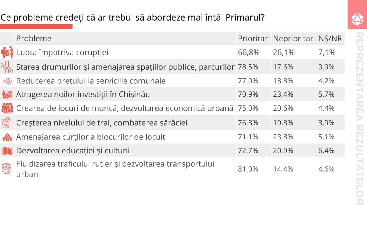 Cu toate că autoritățile par să acorde o atenție mai mare subiectului corupției, acesta se situează pe ultimul loc în ceea ce privește preocupările respondenților. În schimb, transportul, ambuteiajele și tarifele sunt considerate problemele principale, reprezentând prioritățile clare ale locuitorilor Chișinăului.