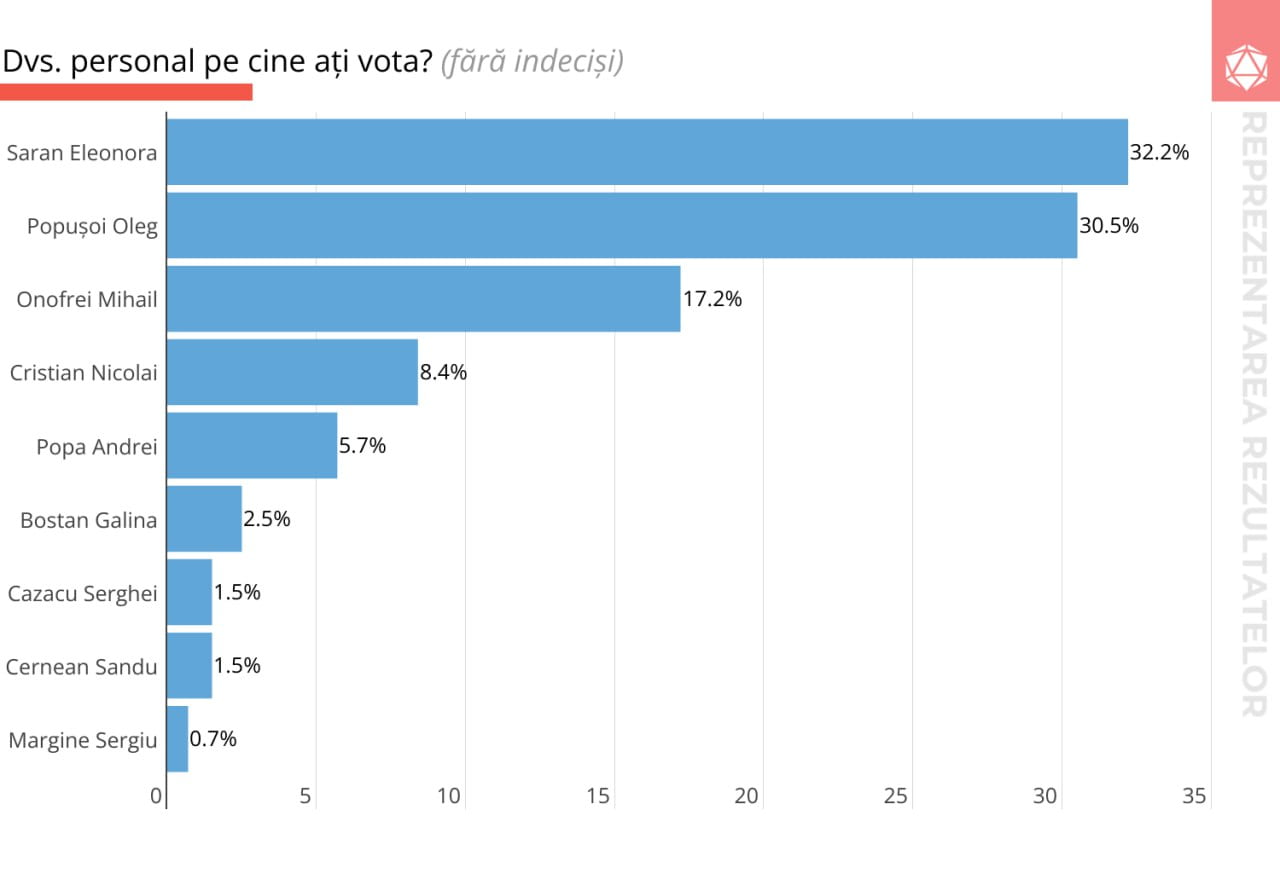 În ceea ce privește competiția pentru primărie, sondajul indică un posibil tur doi între candidatul PAS, Popușoi O. – 30,5% și actualul primar, Saran E. – 32,2% din intențiile de vot.