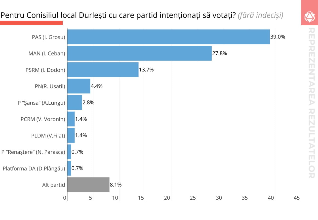 În pragul alegerilor locale din 5 noiembrie 2023, compania de consultanță politică Intellect Group a publicat rezultatele unui sondaj efectuat în localitatea Durlești.