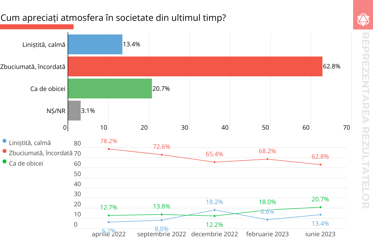 Cu toate acestea, în dinamică, ținând cont de sondajele anterioare (aprilie, septembrie, decembrie 2022 și februarie 2023), această cifră scade treptat, de la un nivel critic de 78% la 62,8% actual. Efectul adaptării psihologice a populației la războiul din Ucraina (în primul rând), precum și la criza socio-economică din țară și regiune, continuă să funcționeze.